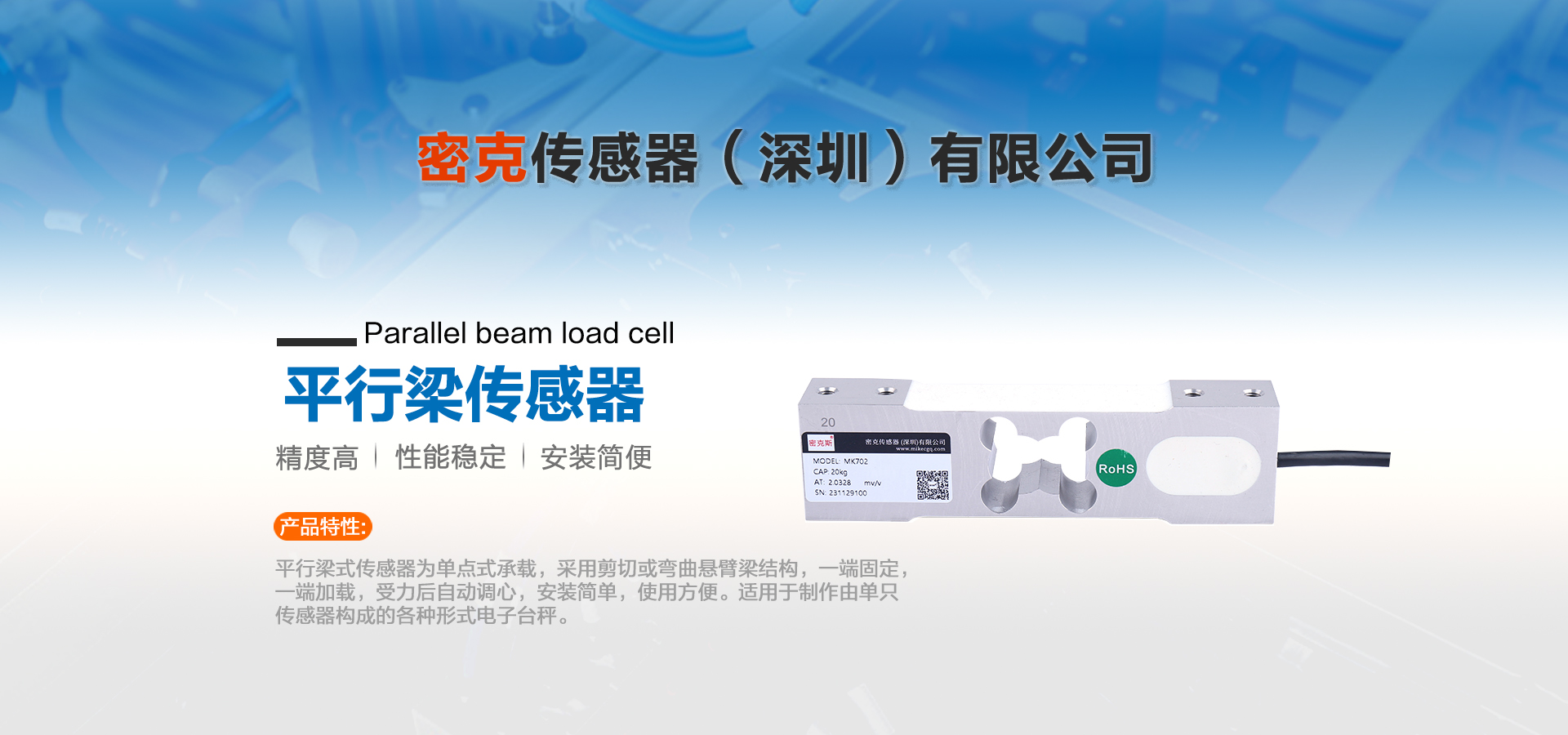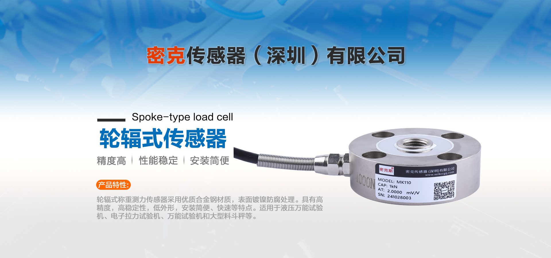 密克傳感器(深圳)有限公司主要生產的產品有測力傳感器、稱重傳感器、拉力傳感器、壓力傳感器、扭矩傳感器,多維力傳感器,電子引伸計等各類力學和稱重傳感器、及其配套儀器儀表和模塊附件的工廠。